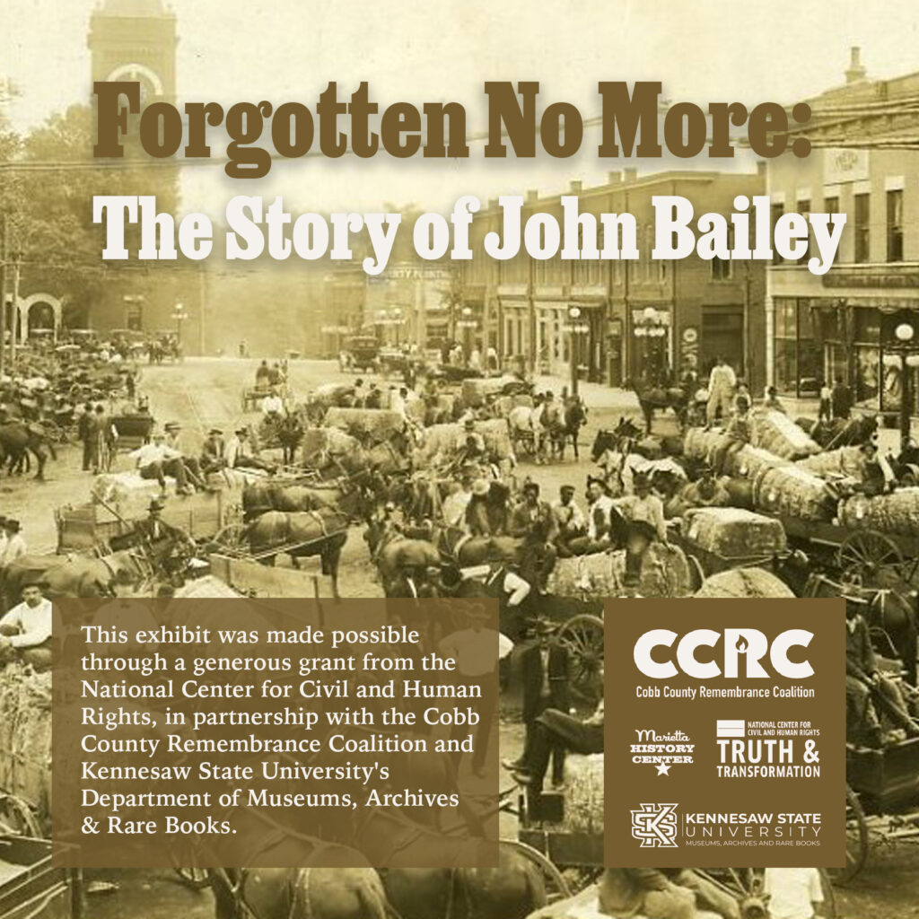 The Marietta History Center is proud to announce the opening of its newest permanent exhibit, Forgotten No More: The Story of John Bailey, a powerful and thoughtfully researched exploration of a tragic chapter in Marietta’s past.